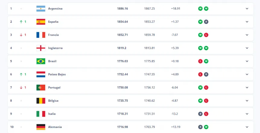 Argentina continúa demostrando su dominio en el fútbol mundial al mantenerse en el primer lugar del ranking FIFA tras una destacada victoria 1-0 ante Uruguay y una histórica goleada 4-1 sobre Brasil. Con 1886,16 puntos, la selección de Lionel Scaloni se consolidó como la mejor del mundo, aumentando su ventaja frente a sus competidores directos, como España, Francia e Inglaterra.